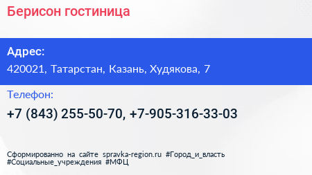 Берисон, гостиница по адресу 420021, Татарстан, Казань, Худякова, 7 в дальнейшем Организация, размещена в следующих категориях: