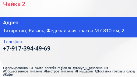 Чайка 2 по адресу Татарстан, Казань, Федеральная трасса М7 810 км, 2 в дальнейшем Организация, размещена в следующих категориях: