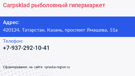 Carpsklad, рыболовный гипермаркет по адресу 420124, Татарстан, Казань, проспект Ямашева, 51а в дальнейшем Организация, размещена в следующих категориях: