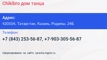 Chikibro, дом танца по адресу 420104, Татарстан, Казань, Родины, 24Б в дальнейшем Организация, размещена в следующих категориях: