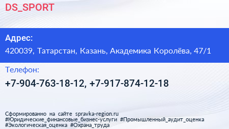 DS_SPORT по адресу 420039, Татарстан, Казань, Академика Королёва, 47/1 в дальнейшем Организация, размещена в следующих категориях: