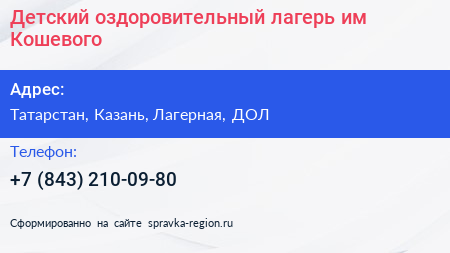 Детский оздоровительный лагерь им. Кошевого по адресу Татарстан, Казань, Лагерная, ДОЛ в дальнейшем Организация, размещена в следующих категориях: