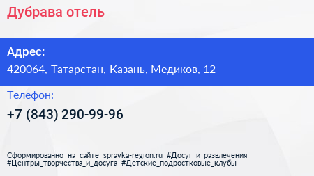Дубрава, отель по адресу 420064, Татарстан, Казань, Медиков, 12 в дальнейшем Организация, размещена в следующих категориях: