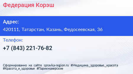 Федерация Корэш по адресу 420111, Татарстан, Казань, Федосеевская, 36 в дальнейшем Организация, размещена в следующих категориях: