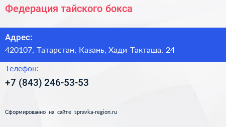 Федерация тайского бокса по адресу 420107, Татарстан, Казань, Хади Такташа, 24 в дальнейшем Организация, размещена в следующих категориях: