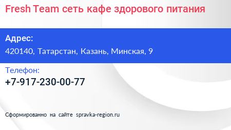 Fresh Team, сеть кафе здорового питания по адресу 420140, Татарстан, Казань, Минская, 9 в дальнейшем Организация, размещена в следующих категориях:
