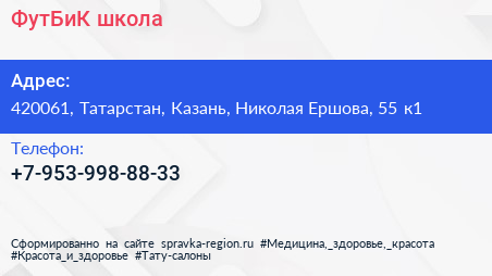 ФутБиК, школа по адресу 420061, Татарстан, Казань, Николая Ершова, 55 к1 в дальнейшем Организация, размещена в следующих категориях: