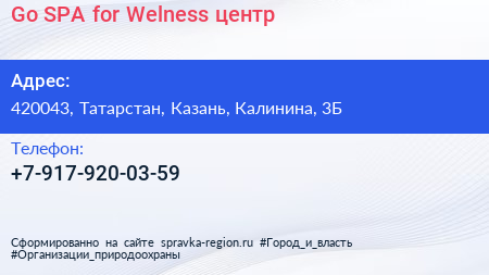 Go SPA for Welness, центр по адресу 420043, Татарстан, Казань, Калинина, 3Б в дальнейшем Организация, размещена в следующих категориях: