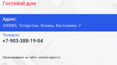 Гостевой дом по адресу 420085, Татарстан, Казань, Бестужева, 7 в дальнейшем Организация, размещена в следующих категориях:
