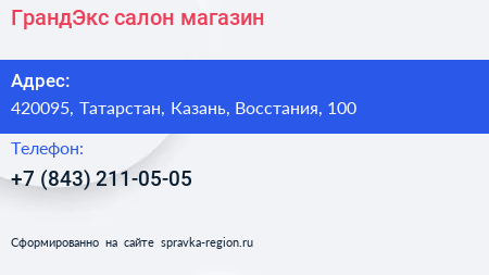 ГрандЭкс, салон-магазин по адресу 420095, Татарстан, Казань, Восстания, 100 в дальнейшем Организация, размещена в следующих категориях: