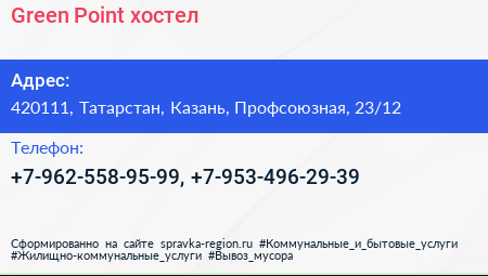 Green Point, хостел по адресу 420111, Татарстан, Казань, Профсоюзная, 23/12 в дальнейшем Организация, размещена в следующих категориях: