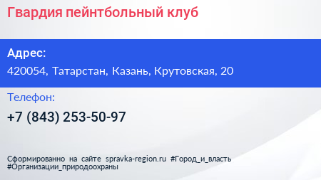 Гвардия, пейнтбольный клуб по адресу 420054, Татарстан, Казань, Крутовская, 20 в дальнейшем Организация, размещена в следующих категориях:
