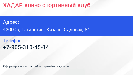 ХАДАР, конно-спортивный клуб по адресу 420005, Татарстан, Казань, Садовая, 81 в дальнейшем Организация, размещена в следующих категориях: