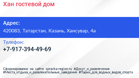 Хан, гостевой дом по адресу 420083, Татарстан, Казань, Хансувар, 4а в дальнейшем Организация, размещена в следующих категориях: