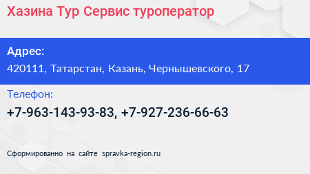 Хазина Тур Сервис, туроператор по адресу 420111, Татарстан, Казань, Чернышевского, 17 в дальнейшем Организация, размещена в следующих категориях: