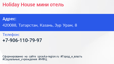 Holiday House, мини-отель по адресу 420088, Татарстан, Казань, Зур Урам, 8 в дальнейшем Организация, размещена в следующих категориях: