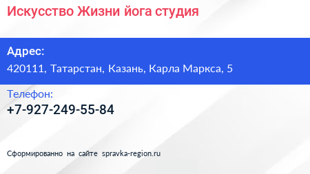 Искусство Жизни, йога-студия по адресу 420111, Татарстан, Казань, Карла Маркса, 5 в дальнейшем Организация, размещена в следующих категориях: