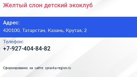 Желтый слон, детский экоклуб по адресу 420100, Татарстан, Казань, Крутая, 2 в дальнейшем Организация, размещена в следующих категориях: