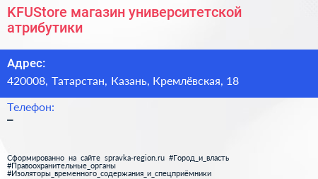 KFUStore, магазин университетской атрибутики по адресу 420008, Татарстан, Казань, Кремлёвская, 18 в дальнейшем Организация, размещена в следующих категориях: