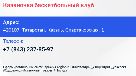 Казаночка, баскетбольный клуб по адресу 420107, Татарстан, Казань, Спартаковская, 1 в дальнейшем Организация, размещена в следующих категориях: