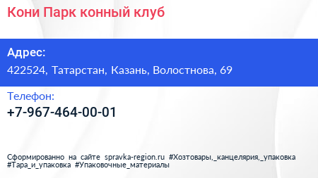 Кони-Парк, конный клуб по адресу 422524, Татарстан, Казань, Волостнова, 69 в дальнейшем Организация, размещена в следующих категориях: