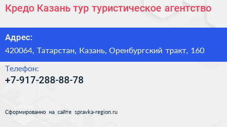 Кредо Казань-тур, туристическое агентство по адресу 420064, Татарстан, Казань, Оренбургский тракт, 160 в дальнейшем Организация, размещена в следующих категориях: