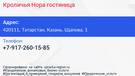 Кроличья Нора, гостиница по адресу 420111, Татарстан, Казань, Щапова, 1 в дальнейшем Организация, размещена в следующих категориях: