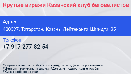 Крутые виражи, Казанский клуб беговелистов по адресу 420097, Татарстан, Казань, Лейтенанта Шмидта, 35 в дальнейшем Организация, размещена в следующих категориях: