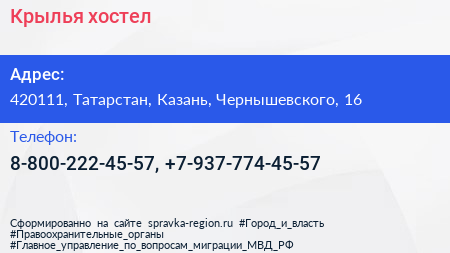 Крылья, хостел по адресу 420111, Татарстан, Казань, Чернышевского, 16 в дальнейшем Организация, размещена в следующих категориях: