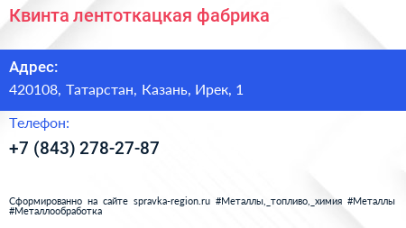 Квинта, лентоткацкая фабрика по адресу 420108, Татарстан, Казань, Ирек, 1 в дальнейшем Организация, размещена в следующих категориях: