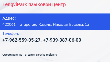 LengviPark, языковой центр по адресу 420061, Татарстан, Казань, Николая Ершова, 1а в дальнейшем Организация, размещена в следующих категориях: