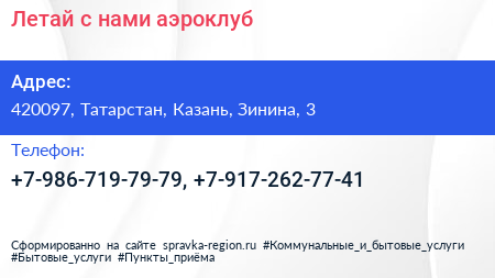 Летай с нами, аэроклуб по адресу 420097, Татарстан, Казань, Зинина, 3 в дальнейшем Организация, размещена в следующих категориях: