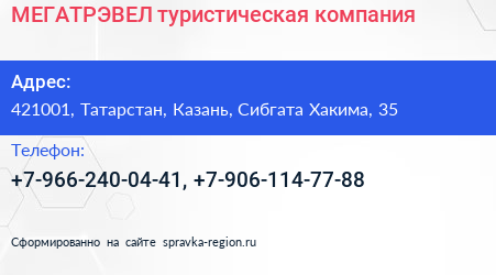 МЕГАТРЭВЕЛ, туристическая компания по адресу 421001, Татарстан, Казань, Сибгата Хакима, 35 в дальнейшем Организация, размещена в следующих категориях:
