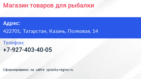 Магазин товаров для рыбалки по адресу 422701, Татарстан, Казань, Полковая, 14 в дальнейшем Организация, размещена в следующих категориях: