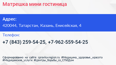 Матрешка, мини-гостиница по адресу 420044, Татарстан, Казань, Енисейская, 4 в дальнейшем Организация, размещена в следующих категориях: