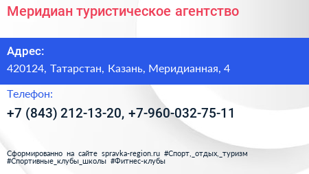 Меридиан, туристическое агентство по адресу 420124, Татарстан, Казань, Меридианная, 4 в дальнейшем Организация, размещена в следующих категориях:
