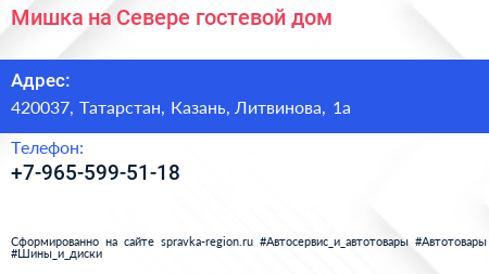 Мишка на Севере, гостевой дом по адресу 420037, Татарстан, Казань, Литвинова, 1а в дальнейшем Организация, размещена в следующих категориях: