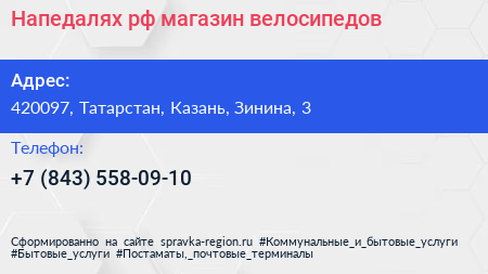 Напедалях.рф, магазин велосипедов по адресу 420097, Татарстан, Казань, Зинина, 3 в дальнейшем Организация, размещена в следующих категориях: