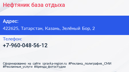 Нефтяник, база отдыха по адресу 422625, Татарстан, Казань, Зелёный Бор, 2 в дальнейшем Организация, размещена в следующих категориях: