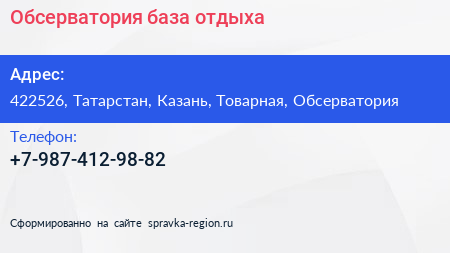 Обсерватория, база отдыха по адресу 422526, Татарстан, Казань, Товарная, Обсерватория в дальнейшем Организация, размещена в следующих категориях: