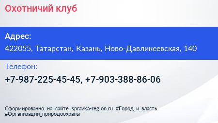 Охотничий клуб по адресу 422055, Татарстан, Казань, Ново-Давликеевская, 140 в дальнейшем Организация, размещена в следующих категориях: