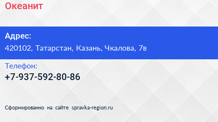 Океанит по адресу 420102, Татарстан, Казань, Чкалова, 7в в дальнейшем Организация, размещена в следующих категориях: