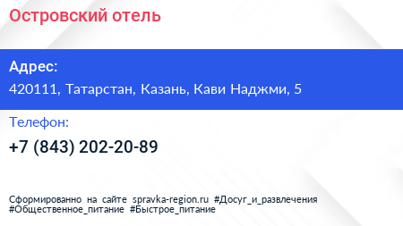 Островский, отель по адресу 420111, Татарстан, Казань, Кави Наджми, 5 в дальнейшем Организация, размещена в следующих категориях:
