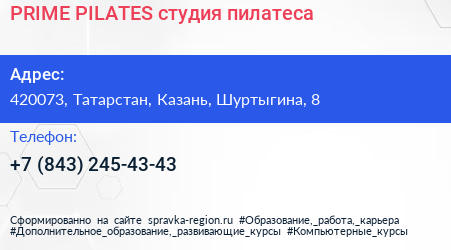 PRIME PILATES, студия пилатеса по адресу 420073, Татарстан, Казань, Шуртыгина, 8 в дальнейшем Организация, размещена в следующих категориях: