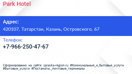 Park Hotel по адресу 420107, Татарстан, Казань, Островского, 67 в дальнейшем Организация, размещена в следующих категориях: