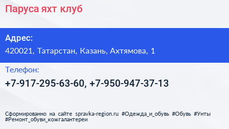 Паруса, яхт-клуб по адресу 420021, Татарстан, Казань, Ахтямова, 1 в дальнейшем Организация, размещена в следующих категориях: