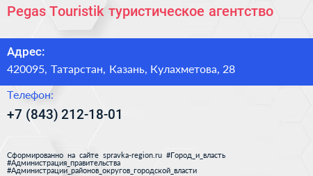 Pegas Touristik, туристическое агентство по адресу 420095, Татарстан, Казань, Кулахметова, 28 в дальнейшем Организация, размещена в следующих категориях: