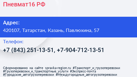 Пневмат16.РФ по адресу 420107, Татарстан, Казань, Павлюхина, 57 в дальнейшем Организация, размещена в следующих категориях: