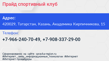 Прайд, спортивный клуб по адресу 420029, Татарстан, Казань, Академика Кирпичникова, 15 в дальнейшем Организация, размещена в следующих категориях: