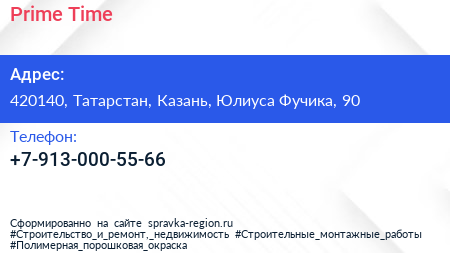 Prime Time по адресу 420140, Татарстан, Казань, Юлиуса Фучика, 90 в дальнейшем Организация, размещена в следующих категориях: